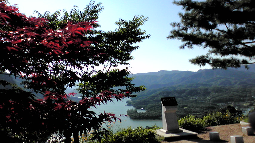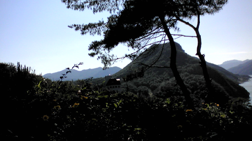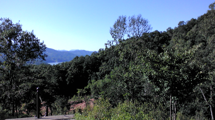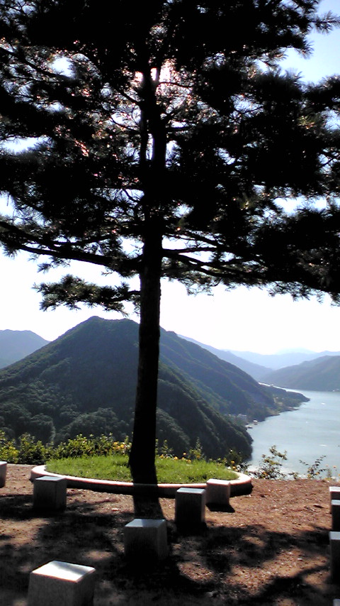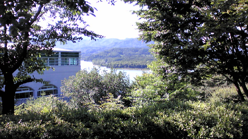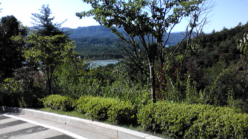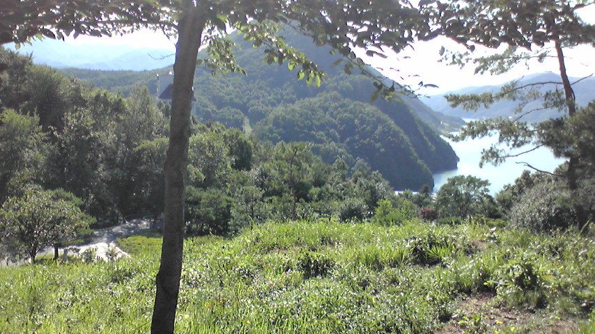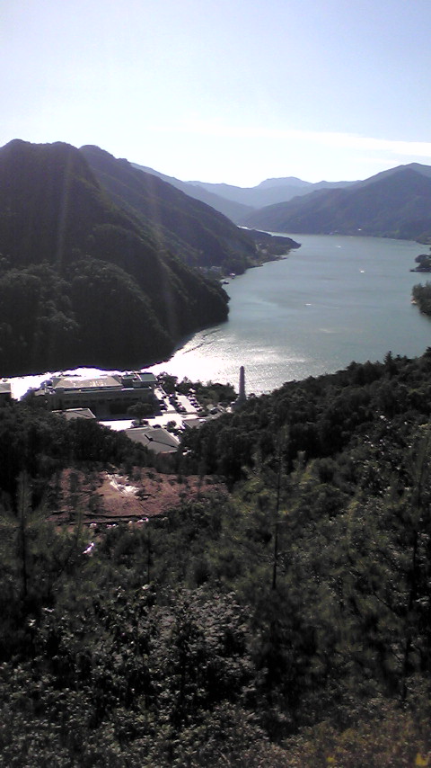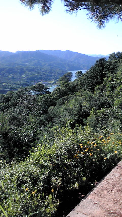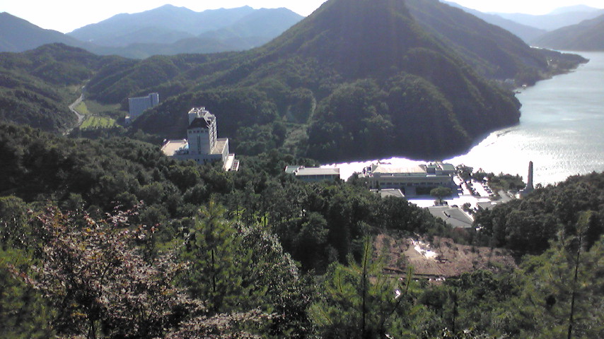 下を見下ろす。親和館・清平湖が見えます。