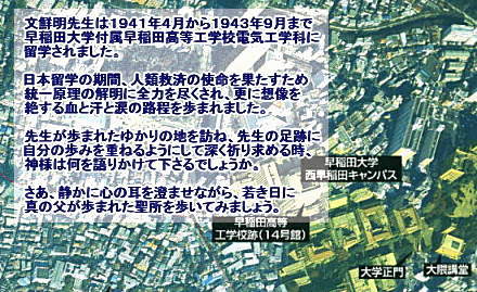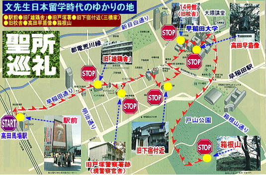 第3代総長高田早苗像●早稲田高等工学校の創設者であり、早稲田 大学の第3代総長でもあられた高田早苗氏 の像です。 ●文先生の卒業アルバムには、この像の前で 文先生を含む8名が写された記念写真が収録 されています。 ●このあと大隈講堂を見学したり、学内食堂を 利用して昼食にするのも良いでしょう。 |